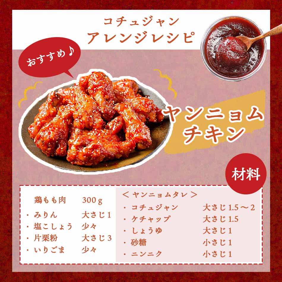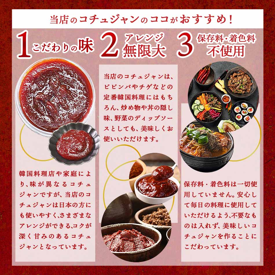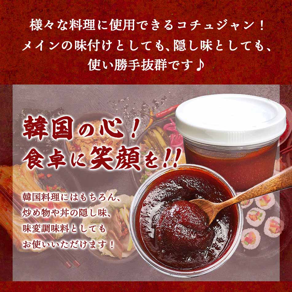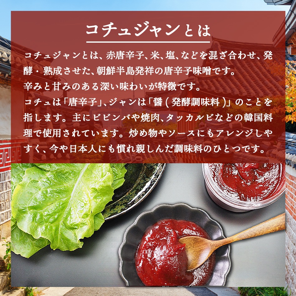 多くの韓国料理の味は、このコチュジャンで決まるといわれています。鍋もの、ご飯もの、煮もの、炒めもの、あえもの、etc..... あらゆる料理によく合い、材料の持ち味を存分に引き出してくれます。
