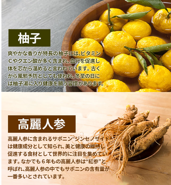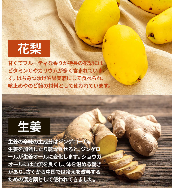 【原材料名】糖漬柚子、イソマルトオリゴ糖、糖漬生姜、糖漬花梨、蜂蜜、生姜濃縮液、シナモン粉末、生姜オレオレジン、紅参濃縮液/クエン酸、ビタミンC