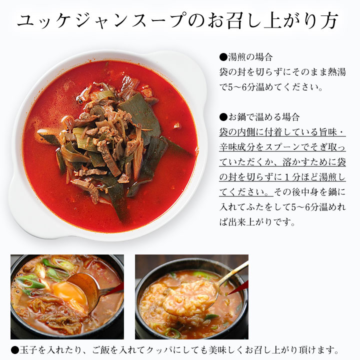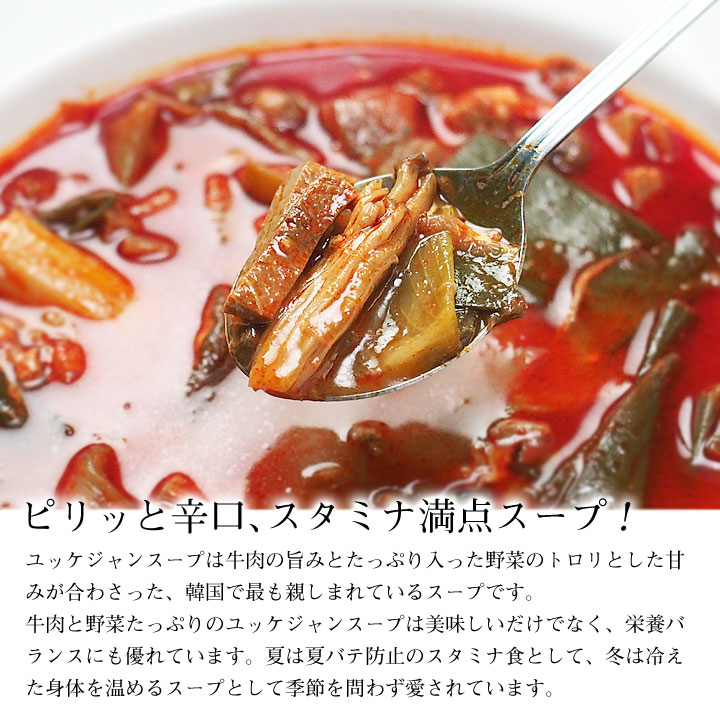 ユッケジャンスープ:ねぎ、牛肉、さつまいものつる、唐辛子混合薬味、平茸、牛風味調味料、牛骨エキス、唐辛子、牛脂、にんにく、醤油)、生姜、胡椒/調味料(核酸等)、(一部に乳成分・小麦・大豆・牛肉・ごまを含む)
