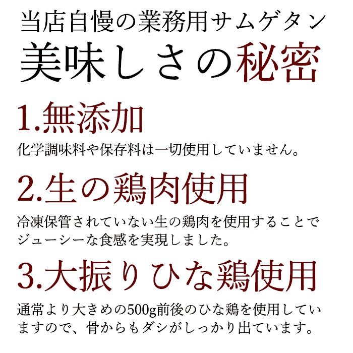サムゲタン:鶏肉(韓国産)、もち米(韓国産)、うるち米(韓国産)、高麗人参(韓国産)、ニンニク(韓国産)、栗(韓国産)、ナツメ(韓国産)、食塩