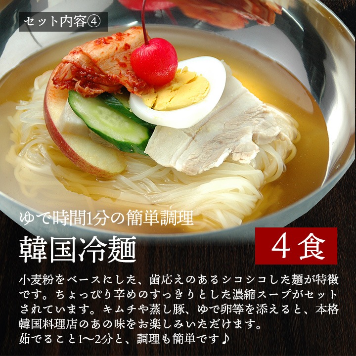 ・韓国冷麺:(麺)小麦粉(国内製造)、でん粉、食塩 / 加工でん粉、酒精