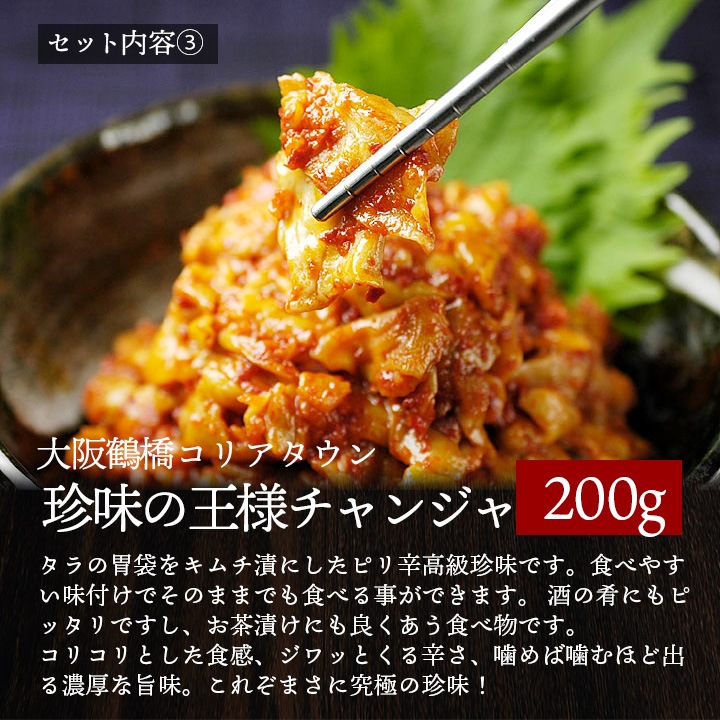 ・チャンジャ:タラの胃(ロシア産)、ニンニク、唐辛子、みりん、ごま油、風味調味料、醤油、鰹風味調味料、塩 / 調味料(アミノ酸)、(一部に小麦・大豆・ごまを含む)