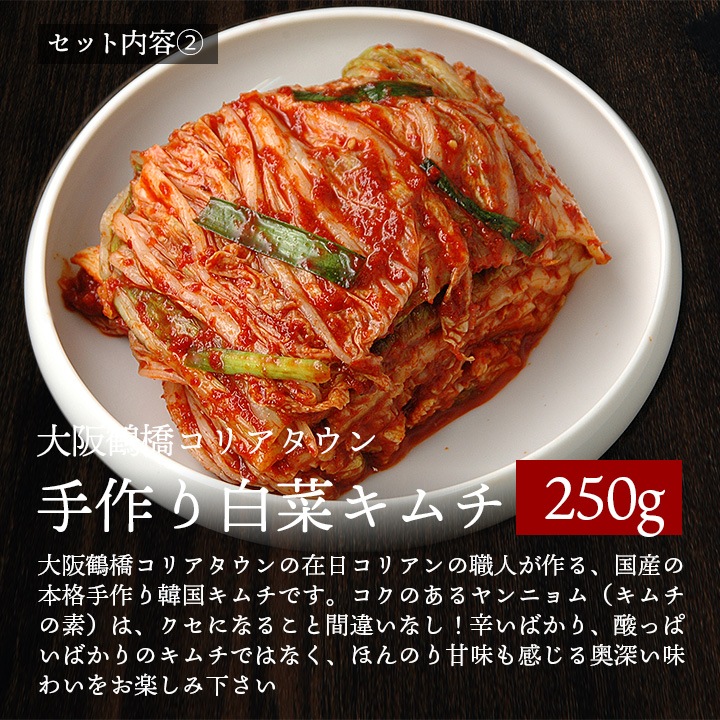 ・白菜キムチ:白菜(国産)、ニラ(国産)、漬け原材料(りんご、唐辛子、アミエビ、砂糖、にんにく、生姜、鰹節、塩) / 調味料(アミノ酸)