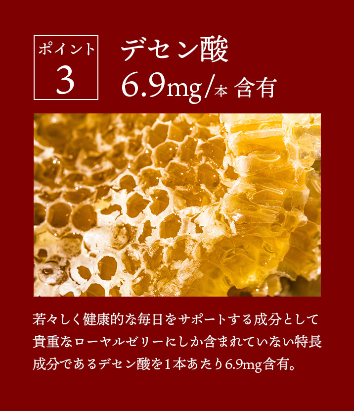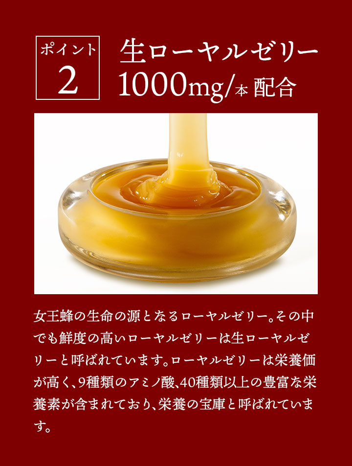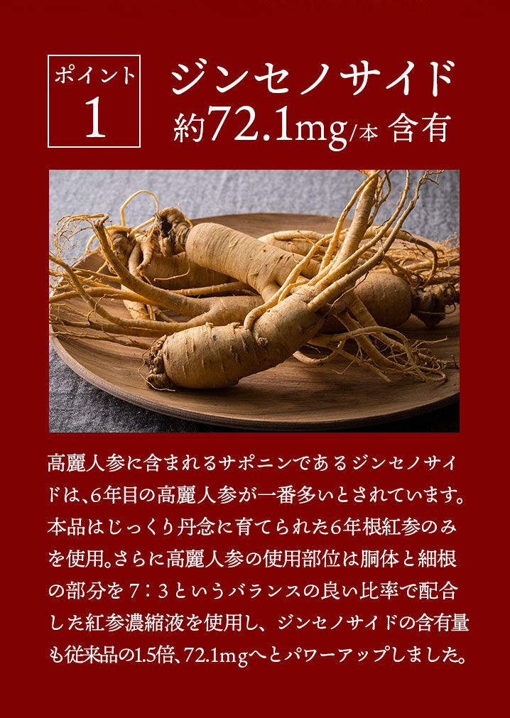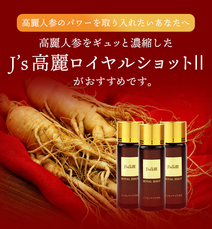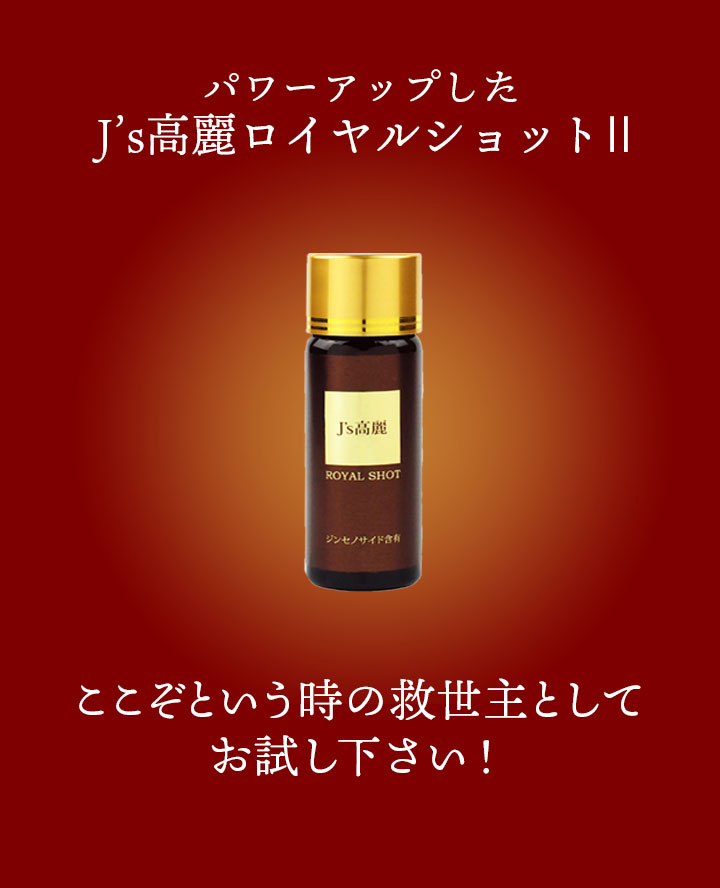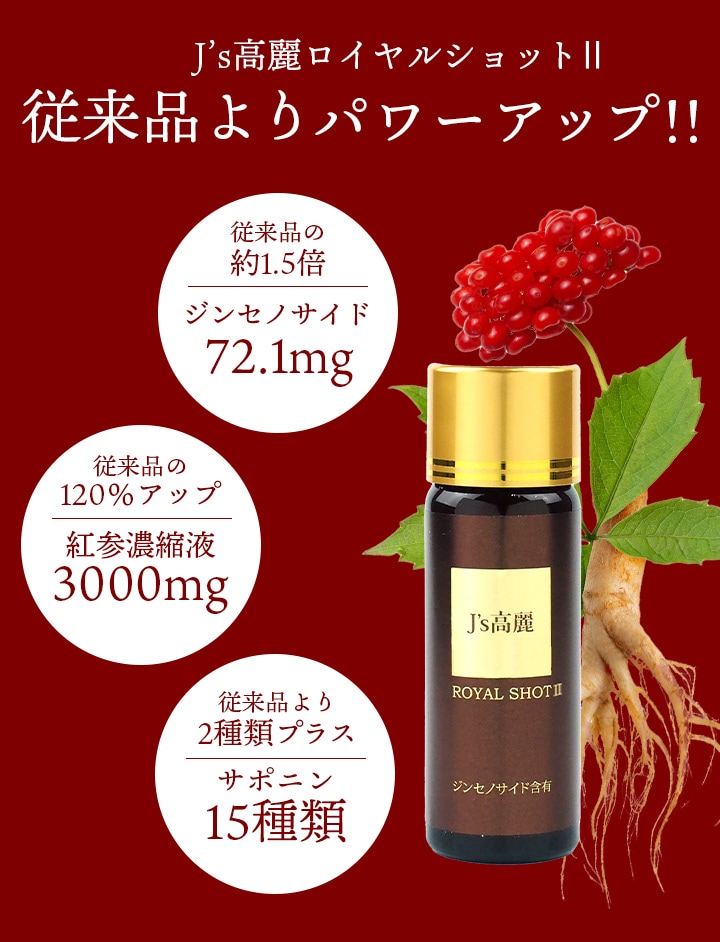 高濃度 高麗人参ドリンク J's 高麗ロイヤルショットは高麗人参に含まれるサポニンであるジンセノサイド約72.1mg/本 含有し、従来品より1.5倍パワーアップ!高麗人参の6年根である紅参を使用し、ジンセノサイドの種類もバランスよく含有。従来品の13種類から15種類へと増量しています。生ローヤルゼリー1000mg/本 配合、デセン酸は約6.9mg/本 含有!疲れすぎて心も体も限界!そんな時に飲んでほしい、ここぞという時の救世主です。従来品よりパワーアップしたロイヤルショット2をぜひお試し下さい!