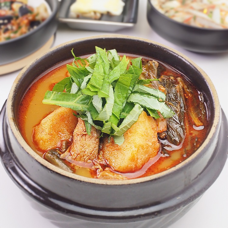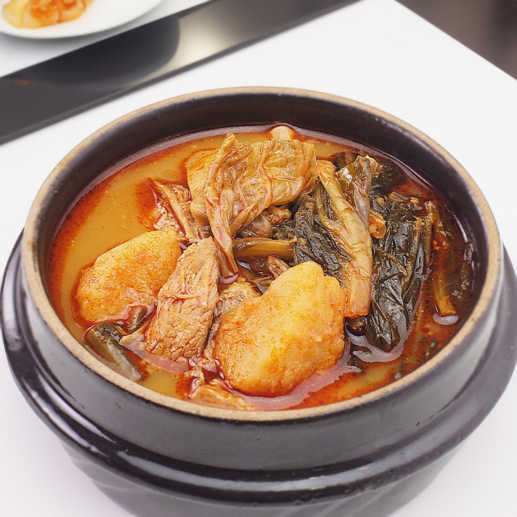 唐辛子やえごまの粉末が入ったピリ辛スープで煮込んだ