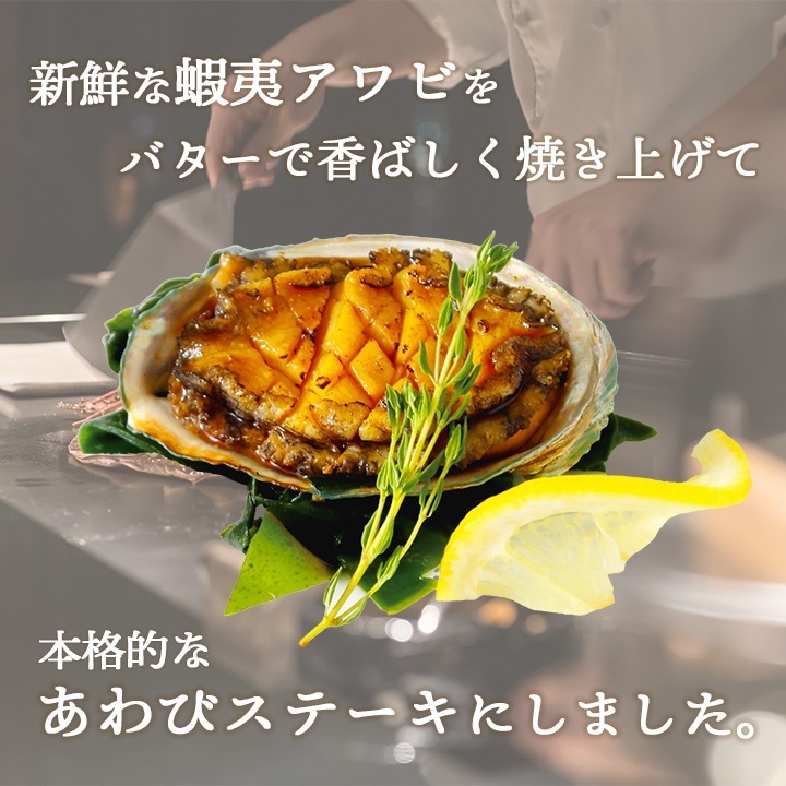 蝦夷アワビを使用し、バターで丁寧に焼き上げて、塩・胡椒でシンプルな味付けにしました。