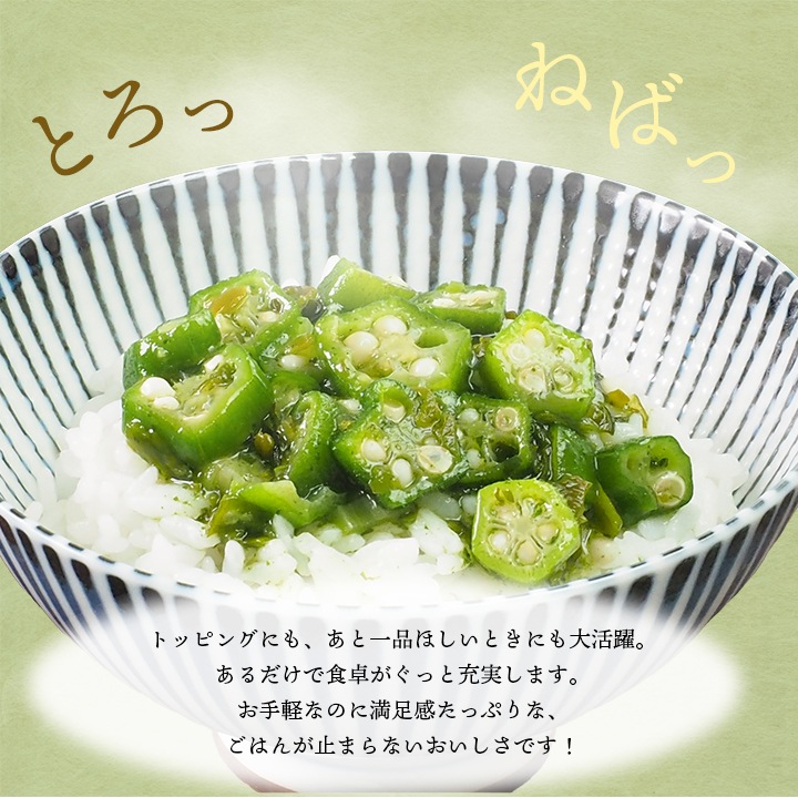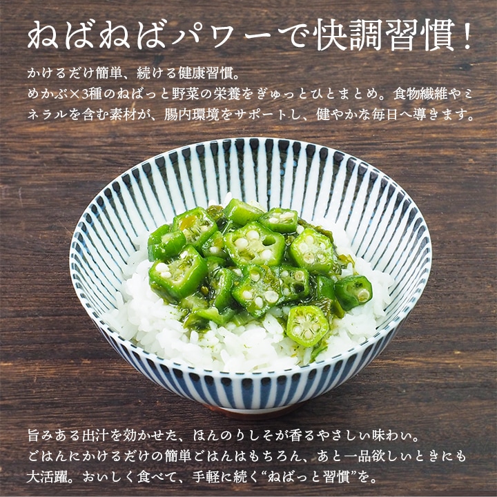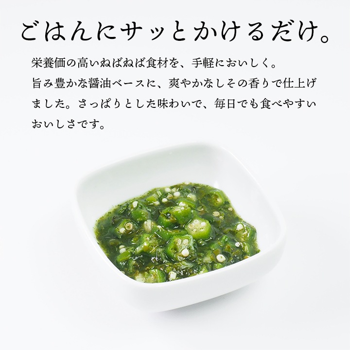 めかぶに加えて、おくら・モロヘイヤ・山芋を合わせ、旨味を引き立てる醤油風味で仕上げました。爽やかなしその香りがアクセントになり、さっぱりと召し上がれます。