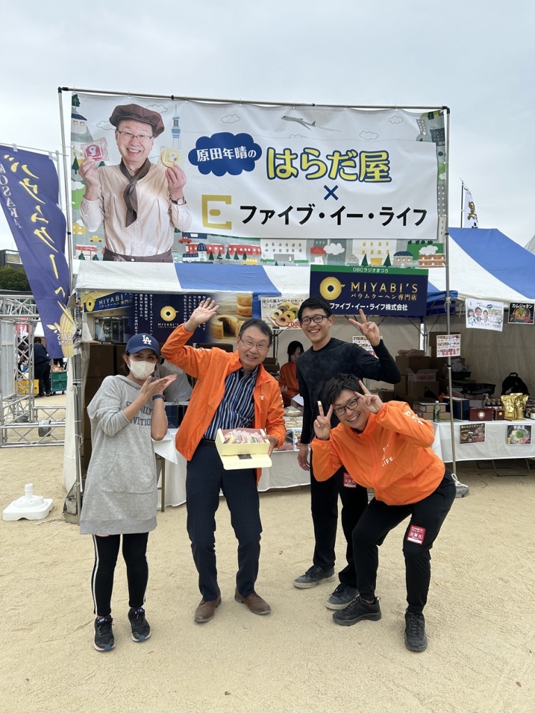 ▲OBCラジオ祭りの際、バウムクーヘンコラボをさせていただいた原田年晴アナウンサーと記念撮影!左から私・保坂、原田年晴アナ、当社・呉龍磨(りょうま)、当社・西野
