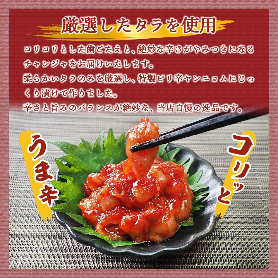【原材料名】タラ胃袋(アメリカ産)、食塩、唐辛子、ヤンニョン、ブドウ糖、水あめ、サイダー、ニンニク、生姜、砂糖、ごま / パプリカ色素、ソルビトール、調味料(アミノ酸等)、(一部にごまを含む)