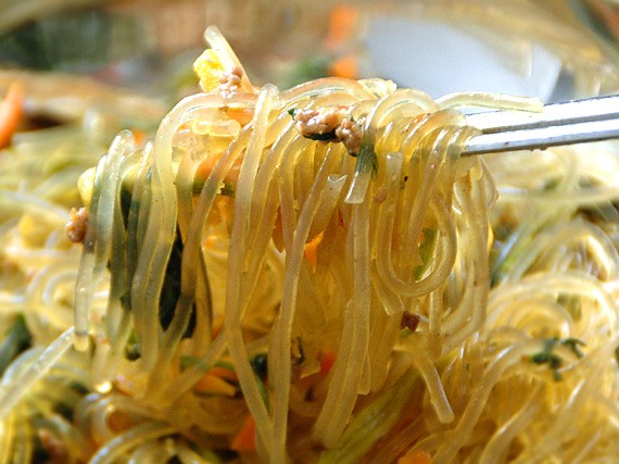 韓国春雨、ミンチ、玉ねぎ、人参、ほうれん草、干ししいたけ入りの渾然一体となった味わいがチャプチェの旨さの秘密。チャッチェはたくさんの素材を混ぜて炒めて食べる料理ですが、それぞれの素材のうまみを活かすために下ごしらえや下味のつけ方などにけっこう手間ひまかかります。