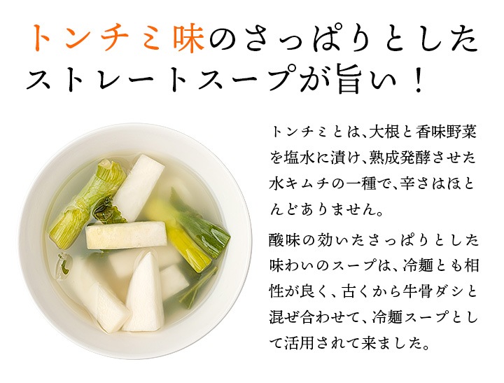 スープ:果糖、砂糖、食塩、ドンチミエキス(大根エキス、きゅうりエキス、麦芽水あめ、食塩、砂糖、醸造酢、果糖、粉末キムチスープ、マルトデキストリン、牛肉シーズニング、にんにくエキス)、醸造酢、牛肉エキス(小麦・大豆・牛肉を含む)、玉ねぎ粉末、にんにく粉末/調味料(アミノ酸等)、pH調整剤、ソルビトール、香料、増粘剤(加工デンプン)