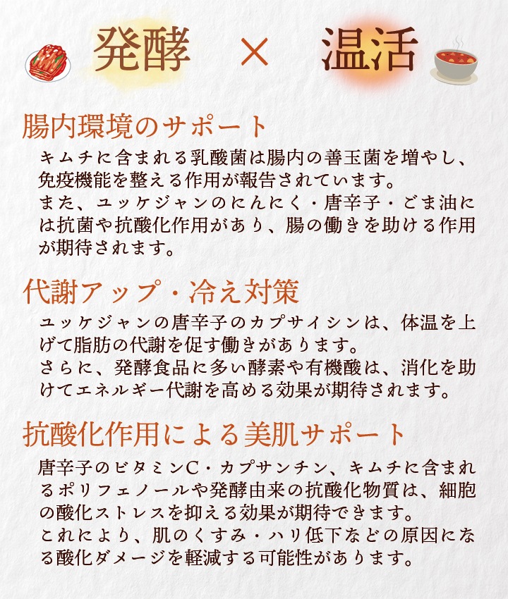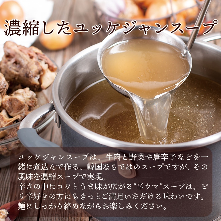 (ユッケジャンスープ)しょうゆ(国内製造)、肉エキス、食塩、砂糖、ガーリック、動物油脂、ごま、植物油脂、豆板醤、ショートニング、唐辛子、酵母エキス / 調味料(アミノ酸等)、増粘剤(加工デンプン、キサンタン)、酒精、カラメル色素、パプリカ色素、香辛料抽出物、酸味料、香料、カロチン色素、(一部に小麦・ごま・大豆・鶏肉・豚肉を含む)