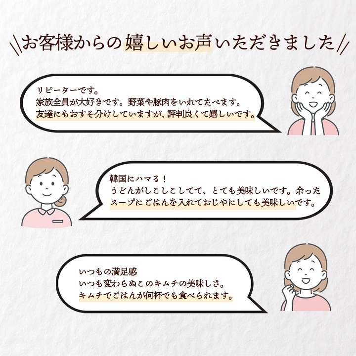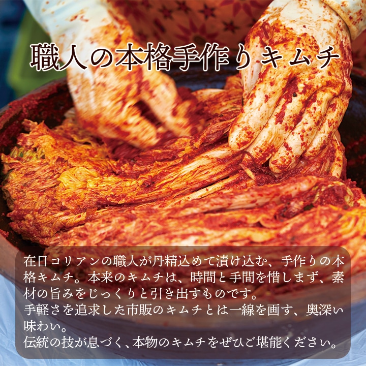 ●白菜キムチ:白菜(国産)、ニラ(国産)、漬け原材料(りんご、唐辛子、アミエビ、砂糖、にんにく、生姜、鰹節、塩) / 調味料(アミノ酸)