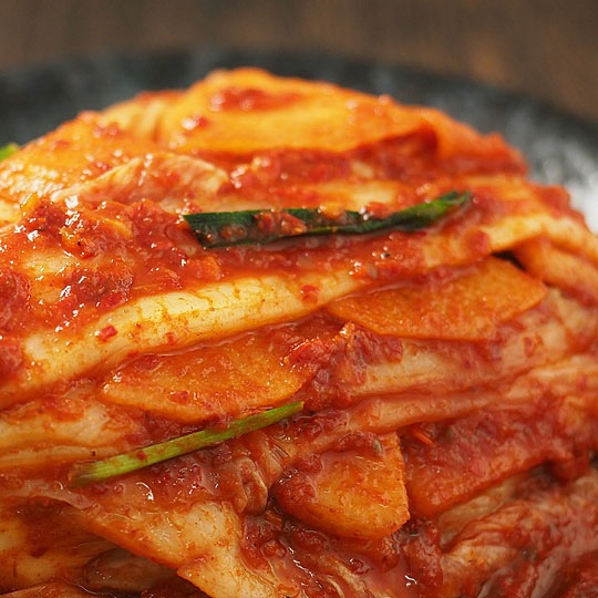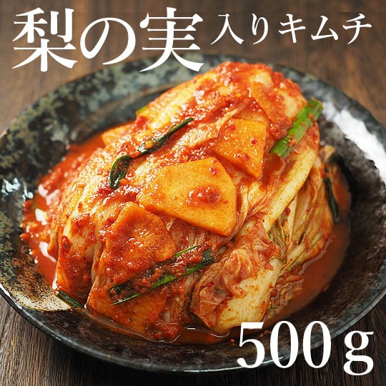 梨の実を入れてしっかり熟成させたキムチは、梨果汁の旨味が白菜にしっかり染みて、ほんのり甘い独特の風味に仕上ります。 ザク切りにした梨をキムチ薬念(ヤンニョム)にまぜこみ、白菜の間に挟み込む、しっかりと発酵させた後に食べるのが好ましい「熟成キムチ好き」の皆さんにオススメの品です。