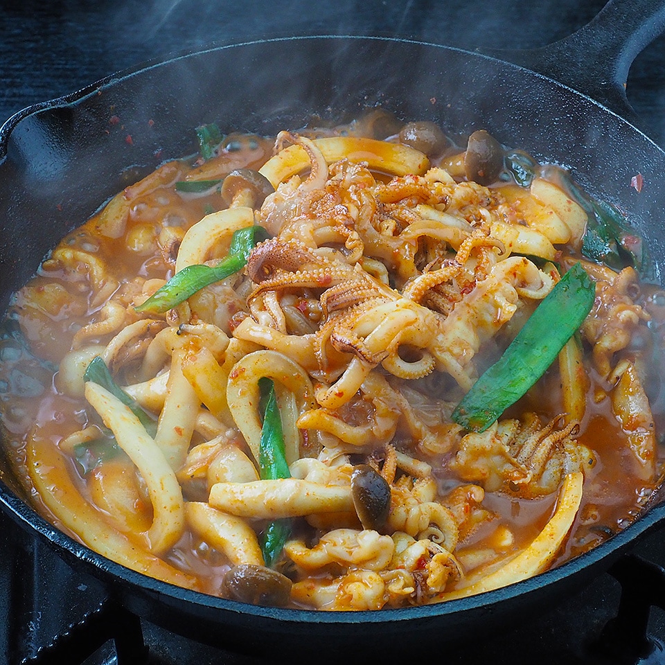 韓国の定番家庭料理 オジンオポックム。ぷりっとしたイカの食感とやみつきになる辛さが特長です。特製のコチュジャンで味付けした状態で冷凍でお届けしますので、野菜を加えて炒めるだけの簡単調理。本格的なオジンオポックムがご自宅で簡単に味わえます。※野菜は別途ご用意ください。