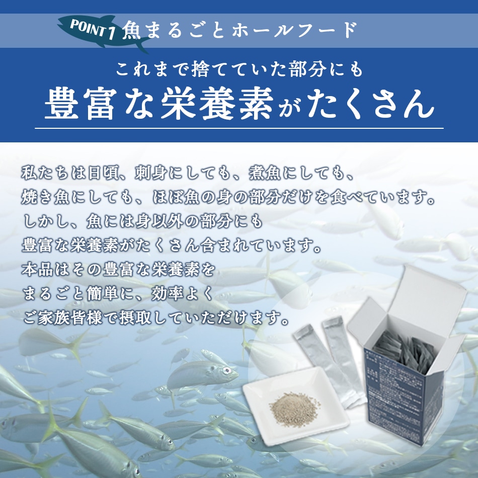 お魚の内臓やアラ、鱗や骨までまるごと食べられるパウダー。